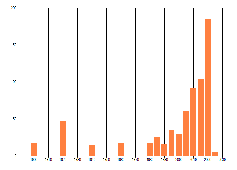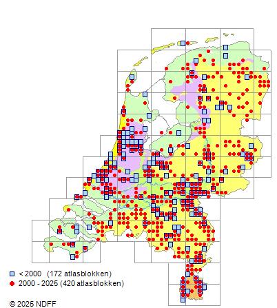 Het aantal atlasblokken (5x5 km) waarin de soort is gemeld binnen een periode van vijf jaar (vanaf 1980) of twintig jaar. Niet gecorrigeerd voor waarnemersinspanning en het aantal doorgegeven waarnemingen kan sterk variëren per periode, dus een trend in verspreiding kan hier niet direct uit worden afgelezen. Het opgegeven jaartal is het eerste jaar van de periode. Bron: gevalideerde waarnemingen uit de NDFF.