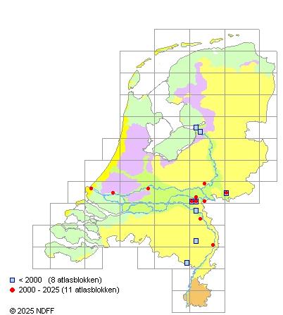 Het aantal atlasblokken (5x5 km) waarin de soort is gemeld binnen een periode van vijf jaar (vanaf 1980) of twintig jaar. Niet gecorrigeerd voor waarnemersinspanning en het aantal doorgegeven waarnemingen kan sterk variëren per periode, dus een trend in verspreiding kan hier niet direct uit worden afgelezen. Het opgegeven jaartal is het eerste jaar van de periode. Bron: gevalideerde waarnemingen uit de NDFF.