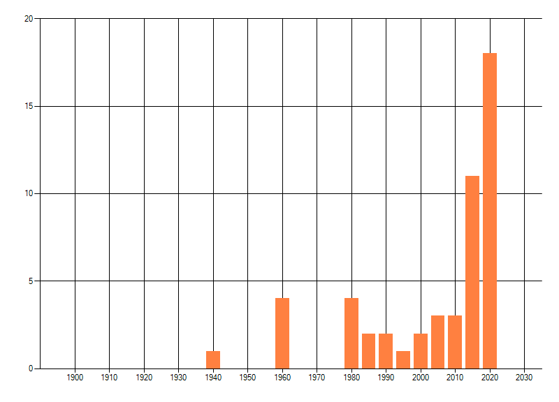 Het aantal atlasblokken (5x5 km) waarin de soort is gemeld binnen een periode van vijf jaar (vanaf 1980) of twintig jaar. Niet gecorrigeerd voor waarnemersinspanning en het aantal doorgegeven waarnemingen kan sterk variëren per periode, dus een trend in verspreiding kan hier niet direct uit worden afgelezen. Het opgegeven jaartal is het eerste jaar van de periode. Bron: gevalideerde waarnemingen uit de NDFF.