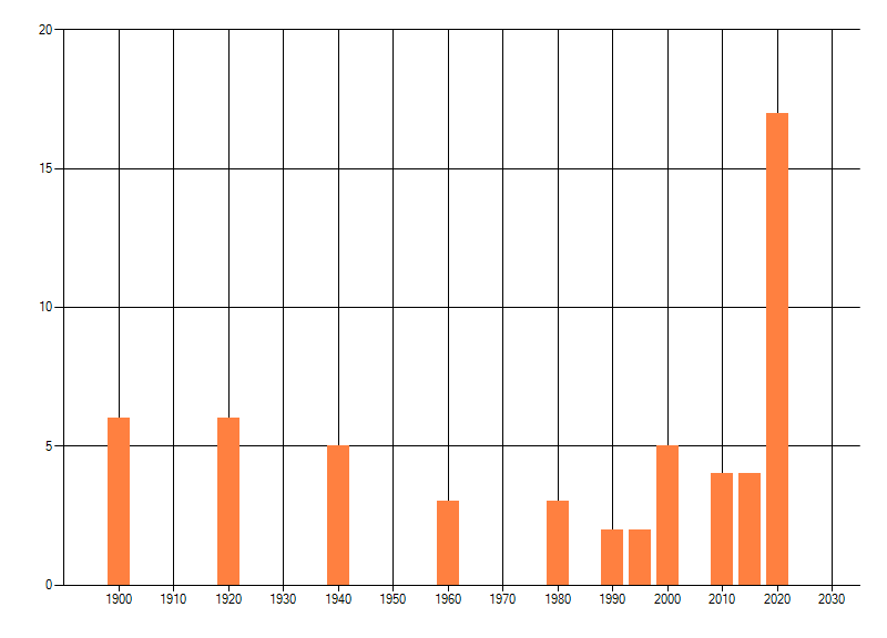 Het aantal atlasblokken (5x5 km) waarin de soort is gemeld binnen een periode van vijf jaar (vanaf 1980) of twintig jaar. Niet gecorrigeerd voor waarnemersinspanning en het aantal doorgegeven waarnemingen kan sterk variëren per periode, dus een trend in verspreiding kan hier niet direct uit worden afgelezen. Het opgegeven jaartal is het eerste jaar van de periode. Bron: gevalideerde waarnemingen uit de NDFF.