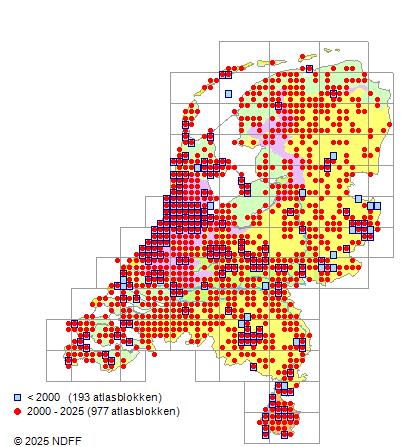 Het aantal atlasblokken (5x5 km) waarin de soort is gemeld binnen een periode van vijf jaar (vanaf 1980) of twintig jaar. Niet gecorrigeerd voor waarnemersinspanning en het aantal doorgegeven waarnemingen kan sterk variëren per periode, dus een trend in verspreiding kan hier niet direct uit worden afgelezen. Het opgegeven jaartal is het eerste jaar van de periode. Bron: gevalideerde waarnemingen uit de NDFF.