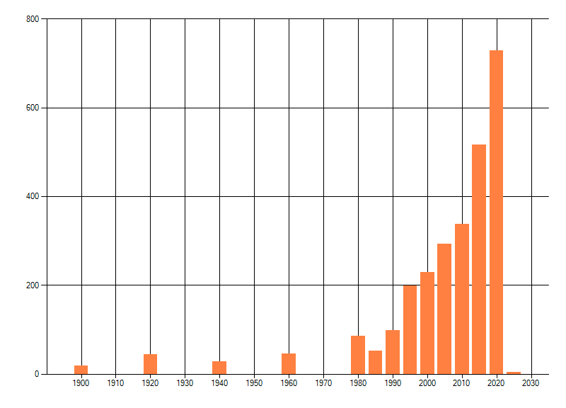 Het aantal atlasblokken (5x5 km) waarin de soort is gemeld binnen een periode van vijf jaar (vanaf 1980) of twintig jaar. Niet gecorrigeerd voor waarnemersinspanning en het aantal doorgegeven waarnemingen kan sterk variƫren per periode, dus een trend in verspreiding kan hier niet direct uit worden afgelezen. Het opgegeven jaartal is het eerste jaar van de periode. Bron: gevalideerde waarnemingen uit de NDFF.
