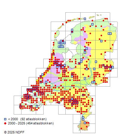 Het aantal atlasblokken (5x5 km) waarin de soort is gemeld binnen een periode van vijf jaar (vanaf 1980) of twintig jaar. Niet gecorrigeerd voor waarnemersinspanning en het aantal doorgegeven waarnemingen kan sterk variëren per periode, dus een trend in verspreiding kan hier niet direct uit worden afgelezen. Het opgegeven jaartal is het eerste jaar van de periode. Bron: gevalideerde waarnemingen uit de NDFF.