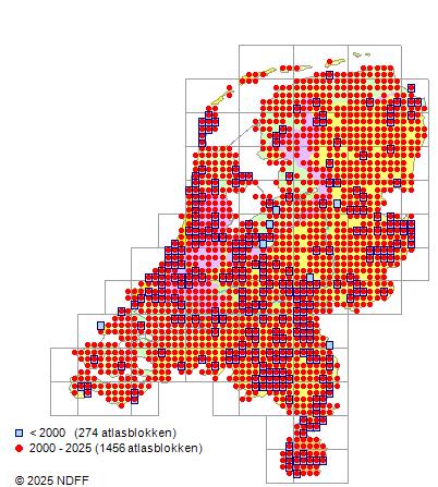 Het aantal atlasblokken (5x5 km) waarin de soort is gemeld binnen een periode van vijf jaar (vanaf 1980) of twintig jaar. Niet gecorrigeerd voor waarnemersinspanning en het aantal doorgegeven waarnemingen kan sterk variëren per periode, dus een trend in verspreiding kan hier niet direct uit worden afgelezen. Het opgegeven jaartal is het eerste jaar van de periode. Bron: gevalideerde waarnemingen uit de NDFF.
