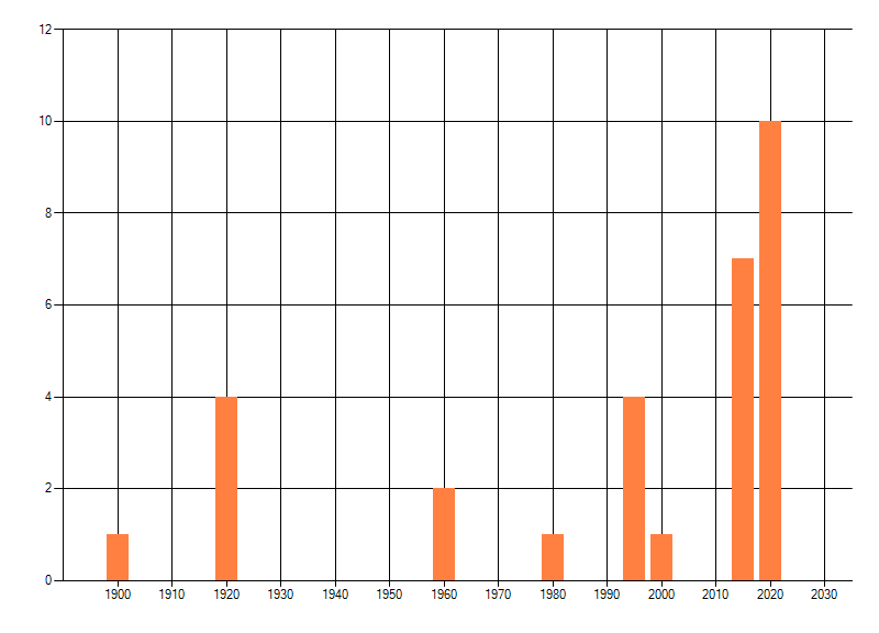 Het aantal atlasblokken (5x5 km) waarin de soort is gemeld binnen een periode van vijf jaar (vanaf 1980) of twintig jaar. Niet gecorrigeerd voor waarnemersinspanning en het aantal doorgegeven waarnemingen kan sterk variëren per periode, dus een trend in verspreiding kan hier niet direct uit worden afgelezen. Het opgegeven jaartal is het eerste jaar van de periode. Bron: gevalideerde waarnemingen uit de NDFF.