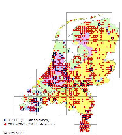 Het aantal atlasblokken (5x5 km) waarin de soort is gemeld binnen een periode van vijf jaar (vanaf 1980) of twintig jaar. Niet gecorrigeerd voor waarnemersinspanning en het aantal doorgegeven waarnemingen kan sterk variëren per periode, dus een trend in verspreiding kan hier niet direct uit worden afgelezen. Het opgegeven jaartal is het eerste jaar van de periode. Bron: gevalideerde waarnemingen uit de NDFF.