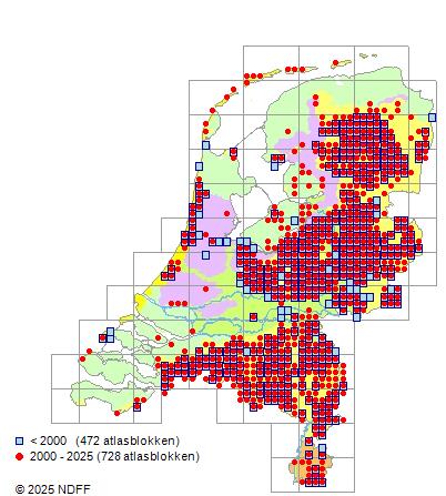 Het aantal atlasblokken (5x5 km) waarin de soort is gemeld binnen een periode van vijf jaar (vanaf 1980) of twintig jaar. Niet gecorrigeerd voor waarnemersinspanning en het aantal doorgegeven waarnemingen kan sterk variëren per periode, dus een trend in verspreiding kan hier niet direct uit worden afgelezen. Het opgegeven jaartal is het eerste jaar van de periode. Bron: gevalideerde waarnemingen uit de NDFF.