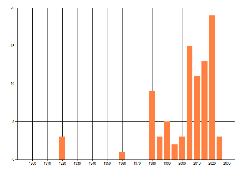 Het aantal atlasblokken (5x5 km) waarin de soort is gemeld binnen een periode van vijf jaar (vanaf 1980) of twintig jaar. Niet gecorrigeerd voor waarnemersinspanning en het aantal doorgegeven waarnemingen kan sterk variëren per periode, dus een trend in verspreiding kan hier niet direct uit worden afgelezen. Het opgegeven jaartal is het eerste jaar van de periode. Bron: gevalideerde waarnemingen uit de NDFF.