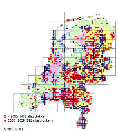 Het aantal atlasblokken (5x5 km) waarin de soort is gemeld binnen een periode van vijf jaar (vanaf 1980) of twintig jaar. Niet gecorrigeerd voor waarnemersinspanning en het aantal doorgegeven waarnemingen kan sterk variëren per periode, dus een trend in verspreiding kan hier niet direct uit worden afgelezen. Het opgegeven jaartal is het eerste jaar van de periode. Bron: gevalideerde waarnemingen uit de NDFF.