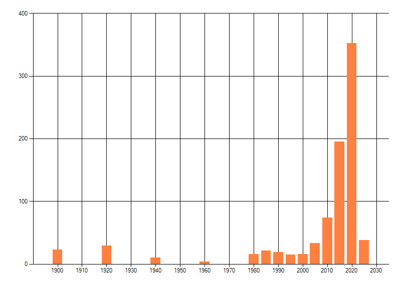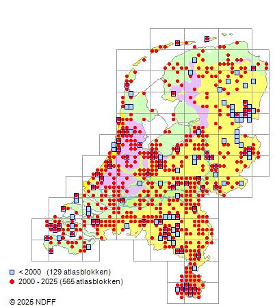 Het aantal atlasblokken (5x5 km) waarin de soort is gemeld binnen een periode van vijf jaar (vanaf 1980) of twintig jaar. Niet gecorrigeerd voor waarnemersinspanning en het aantal doorgegeven waarnemingen kan sterk variëren per periode, dus een trend in verspreiding kan hier niet direct uit worden afgelezen. Het opgegeven jaartal is het eerste jaar van de periode. Bron: gevalideerde waarnemingen uit de NDFF.