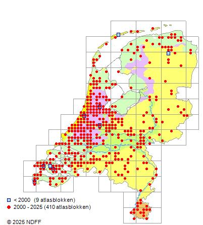 Het aantal atlasblokken (5x5 km) waarin de soort is gemeld binnen een periode van vijf jaar (vanaf 1980) of twintig jaar. Niet gecorrigeerd voor waarnemersinspanning en het aantal doorgegeven waarnemingen kan sterk variëren per periode, dus een trend in verspreiding kan hier niet direct uit worden afgelezen. Het opgegeven jaartal is het eerste jaar van de periode. Bron: gevalideerde waarnemingen uit de NDFF.