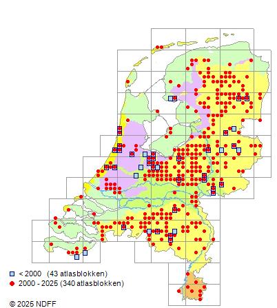 Het aantal atlasblokken (5x5 km) waarin de soort is gemeld binnen een periode van vijf jaar (vanaf 1980) of twintig jaar. Niet gecorrigeerd voor waarnemersinspanning en het aantal doorgegeven waarnemingen kan sterk variƫren per periode, dus een trend in verspreiding kan hier niet direct uit worden afgelezen. Het opgegeven jaartal is het eerste jaar van de periode. Bron: gevalideerde waarnemingen uit de NDFF.