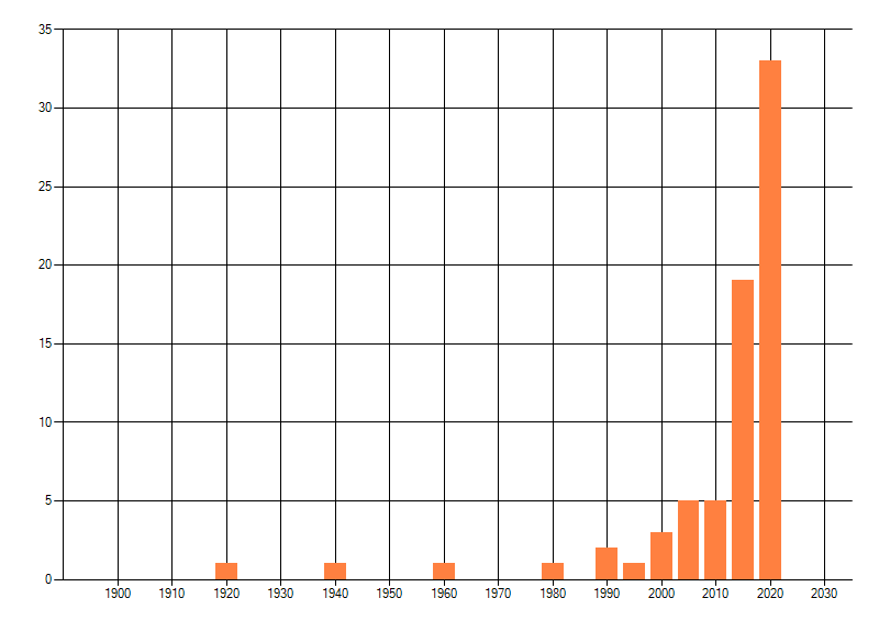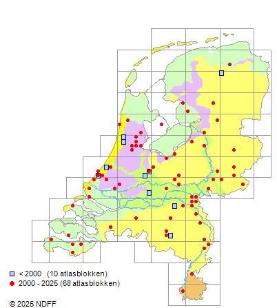Het aantal atlasblokken (5x5 km) waarin de soort is gemeld binnen een periode van vijf jaar (vanaf 1980) of twintig jaar. Niet gecorrigeerd voor waarnemersinspanning en het aantal doorgegeven waarnemingen kan sterk variëren per periode, dus een trend in verspreiding kan hier niet direct uit worden afgelezen. Het opgegeven jaartal is het eerste jaar van de periode. Bron: gevalideerde waarnemingen uit de NDFF.