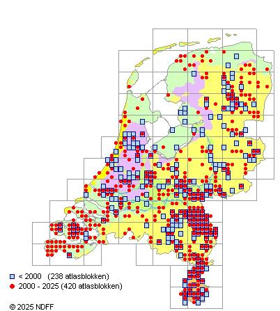 Het aantal atlasblokken (5x5 km) waarin de soort is gemeld binnen een periode van vijf jaar (vanaf 1980) of twintig jaar. Niet gecorrigeerd voor waarnemersinspanning en het aantal doorgegeven waarnemingen kan sterk variëren per periode, dus een trend in verspreiding kan hier niet direct uit worden afgelezen. Het opgegeven jaartal is het eerste jaar van de periode. Bron: gevalideerde waarnemingen uit de NDFF.
