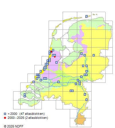 Het aantal atlasblokken (5x5 km) waarin de soort is gemeld binnen een periode van vijf jaar (vanaf 1980) of twintig jaar. Niet gecorrigeerd voor waarnemersinspanning en het aantal doorgegeven waarnemingen kan sterk variëren per periode, dus een trend in verspreiding kan hier niet direct uit worden afgelezen. Het opgegeven jaartal is het eerste jaar van de periode. Bron: gevalideerde waarnemingen uit de NDFF.
