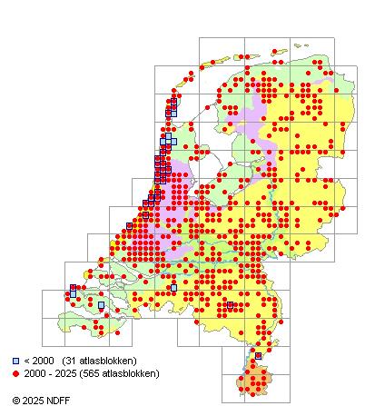 Het aantal atlasblokken (5x5 km) waarin de soort is gemeld binnen een periode van vijf jaar (vanaf 1980) of twintig jaar. Niet gecorrigeerd voor waarnemersinspanning en het aantal doorgegeven waarnemingen kan sterk variëren per periode, dus een trend in verspreiding kan hier niet direct uit worden afgelezen. Het opgegeven jaartal is het eerste jaar van de periode. Bron: gevalideerde waarnemingen uit de NDFF.