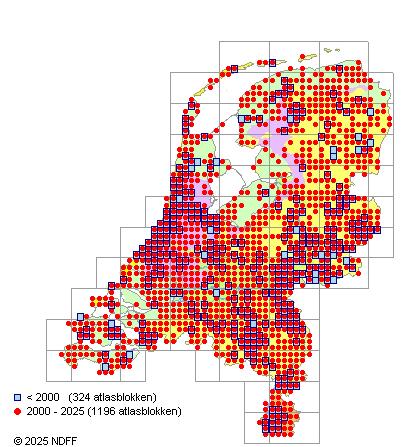 Het aantal atlasblokken (5x5 km) waarin de soort is gemeld binnen een periode van vijf jaar (vanaf 1980) of twintig jaar. Niet gecorrigeerd voor waarnemersinspanning en het aantal doorgegeven waarnemingen kan sterk variƫren per periode, dus een trend in verspreiding kan hier niet direct uit worden afgelezen. Het opgegeven jaartal is het eerste jaar van de periode. Bron: gevalideerde waarnemingen uit de NDFF.