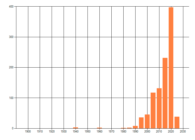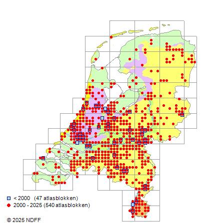 Het aantal atlasblokken (5x5 km) waarin de soort is gemeld binnen een periode van vijf jaar (vanaf 1980) of twintig jaar. Niet gecorrigeerd voor waarnemersinspanning en het aantal doorgegeven waarnemingen kan sterk variëren per periode, dus een trend in verspreiding kan hier niet direct uit worden afgelezen. Het opgegeven jaartal is het eerste jaar van de periode. Bron: gevalideerde waarnemingen uit de NDFF.