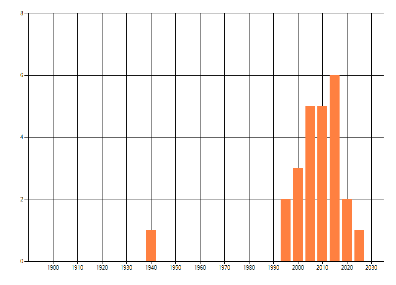 Het aantal atlasblokken (5x5 km) waarin de soort is gemeld binnen een periode van vijf jaar (vanaf 1980) of twintig jaar. Niet gecorrigeerd voor waarnemersinspanning en het aantal doorgegeven waarnemingen kan sterk variƫren per periode, dus een trend in verspreiding kan hier niet direct uit worden afgelezen. Het opgegeven jaartal is het eerste jaar van de periode. Bron: gevalideerde waarnemingen uit de NDFF.