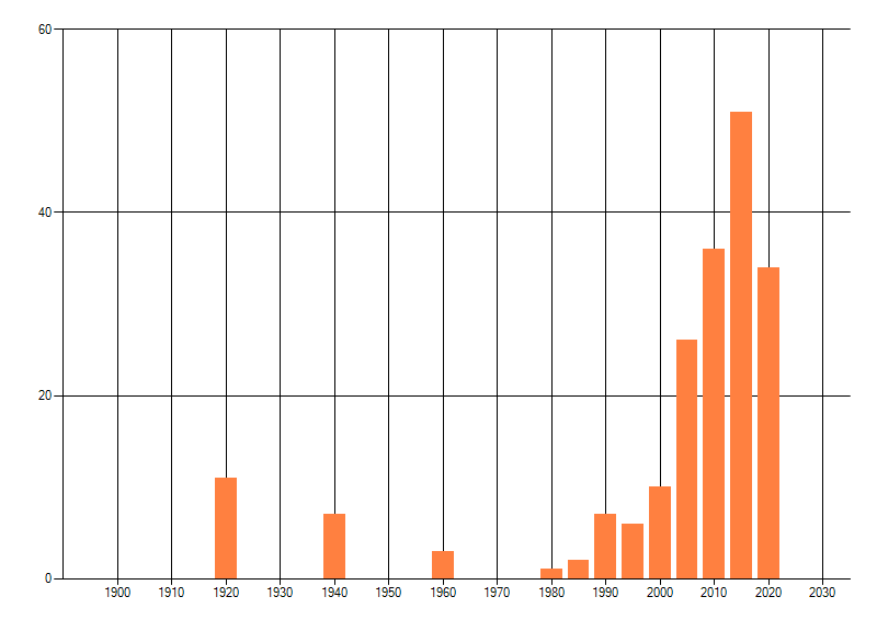 Het aantal atlasblokken (5x5 km) waarin de soort is gemeld binnen een periode van vijf jaar (vanaf 1980) of twintig jaar. Niet gecorrigeerd voor waarnemersinspanning en het aantal doorgegeven waarnemingen kan sterk variëren per periode, dus een trend in verspreiding kan hier niet direct uit worden afgelezen. Het opgegeven jaartal is het eerste jaar van de periode. Bron: gevalideerde waarnemingen uit de NDFF.
