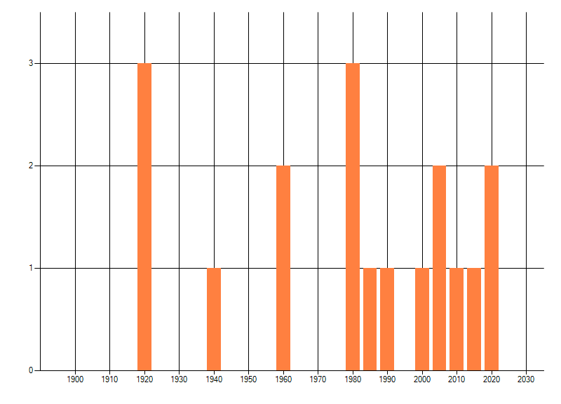 Het aantal atlasblokken (5x5 km) waarin de soort is gemeld binnen een periode van vijf jaar (vanaf 1980) of twintig jaar. Niet gecorrigeerd voor waarnemersinspanning en het aantal doorgegeven waarnemingen kan sterk variëren per periode, dus een trend in verspreiding kan hier niet direct uit worden afgelezen. Het opgegeven jaartal is het eerste jaar van de periode. Bron: gevalideerde waarnemingen uit de NDFF.