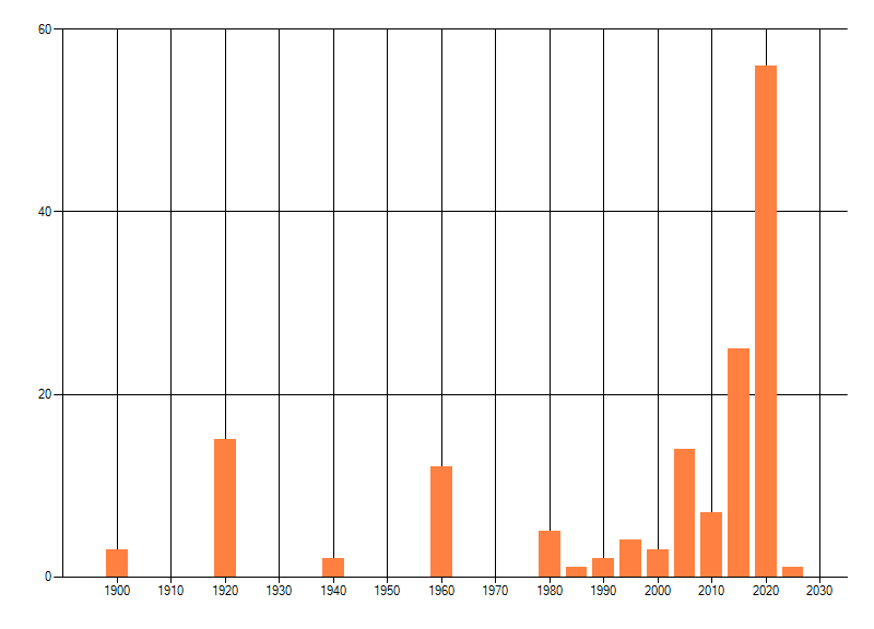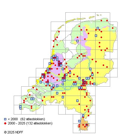 Het aantal atlasblokken (5x5 km) waarin de soort is gemeld binnen een periode van vijf jaar (vanaf 1980) of twintig jaar. Niet gecorrigeerd voor waarnemersinspanning en het aantal doorgegeven waarnemingen kan sterk variëren per periode, dus een trend in verspreiding kan hier niet direct uit worden afgelezen. Het opgegeven jaartal is het eerste jaar van de periode. Bron: gevalideerde waarnemingen uit de NDFF.
