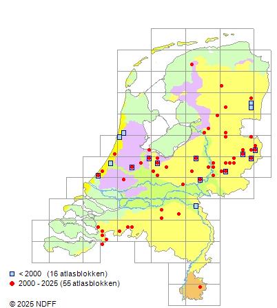 Het aantal atlasblokken (5x5 km) waarin de soort is gemeld binnen een periode van vijf jaar (vanaf 1980) of twintig jaar. Niet gecorrigeerd voor waarnemersinspanning en het aantal doorgegeven waarnemingen kan sterk variëren per periode, dus een trend in verspreiding kan hier niet direct uit worden afgelezen. Het opgegeven jaartal is het eerste jaar van de periode. Bron: gevalideerde waarnemingen uit de NDFF.