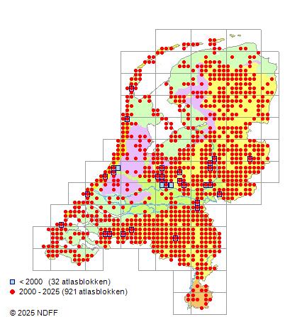 Het aantal atlasblokken (5x5 km) waarin de soort is gemeld binnen een periode van vijf jaar (vanaf 1980) of twintig jaar. Niet gecorrigeerd voor waarnemersinspanning en het aantal doorgegeven waarnemingen kan sterk variëren per periode, dus een trend in verspreiding kan hier niet direct uit worden afgelezen. Het opgegeven jaartal is het eerste jaar van de periode. Bron: gevalideerde waarnemingen uit de NDFF.