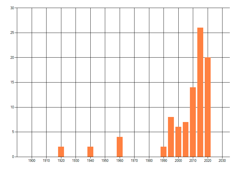 Het aantal atlasblokken (5x5 km) waarin de soort is gemeld binnen een periode van vijf jaar (vanaf 1980) of twintig jaar. Niet gecorrigeerd voor waarnemersinspanning en het aantal doorgegeven waarnemingen kan sterk variëren per periode, dus een trend in verspreiding kan hier niet direct uit worden afgelezen. Het opgegeven jaartal is het eerste jaar van de periode. Bron: gevalideerde waarnemingen uit de NDFF.