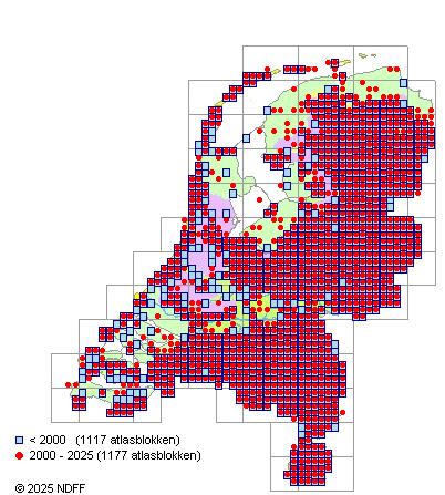 Het aantal atlasblokken (5x5 km) waarin de soort is gemeld binnen een periode van vijf jaar (vanaf 1980) of twintig jaar. Niet gecorrigeerd voor waarnemersinspanning en het aantal doorgegeven waarnemingen kan sterk variëren per periode, dus een trend in verspreiding kan hier niet direct uit worden afgelezen. Het opgegeven jaartal is het eerste jaar van de periode. Bron: gevalideerde waarnemingen uit de NDFF.