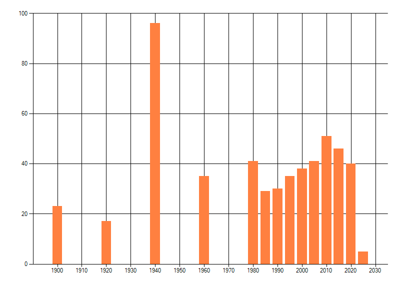 Het aantal atlasblokken (5x5 km) waarin de soort is gemeld binnen een periode van vijf jaar (vanaf 1980) of twintig jaar. Niet gecorrigeerd voor waarnemersinspanning en het aantal doorgegeven waarnemingen kan sterk variƫren per periode, dus een trend in verspreiding kan hier niet direct uit worden afgelezen. Het opgegeven jaartal is het eerste jaar van de periode. Bron: gevalideerde waarnemingen uit de NDFF.