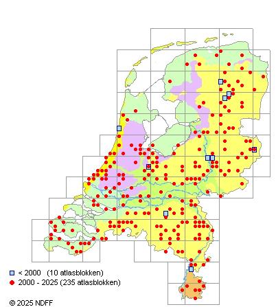 Het aantal atlasblokken (5x5 km) waarin de soort is gemeld binnen een periode van vijf jaar (vanaf 1980) of twintig jaar. Niet gecorrigeerd voor waarnemersinspanning en het aantal doorgegeven waarnemingen kan sterk variëren per periode, dus een trend in verspreiding kan hier niet direct uit worden afgelezen. Het opgegeven jaartal is het eerste jaar van de periode. Bron: gevalideerde waarnemingen uit de NDFF.