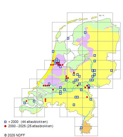 Het aantal atlasblokken (5x5 km) waarin de soort is gemeld binnen een periode van vijf jaar (vanaf 1980) of twintig jaar. Niet gecorrigeerd voor waarnemersinspanning en het aantal doorgegeven waarnemingen kan sterk variëren per periode, dus een trend in verspreiding kan hier niet direct uit worden afgelezen. Het opgegeven jaartal is het eerste jaar van de periode. Bron: gevalideerde waarnemingen uit de NDFF.