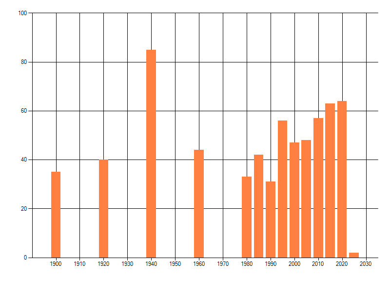 Het aantal atlasblokken (5x5 km) waarin de soort is gemeld binnen een periode van vijf jaar (vanaf 1980) of twintig jaar. Niet gecorrigeerd voor waarnemersinspanning en het aantal doorgegeven waarnemingen kan sterk variëren per periode, dus een trend in verspreiding kan hier niet direct uit worden afgelezen. Het opgegeven jaartal is het eerste jaar van de periode. Bron: gevalideerde waarnemingen uit de NDFF.