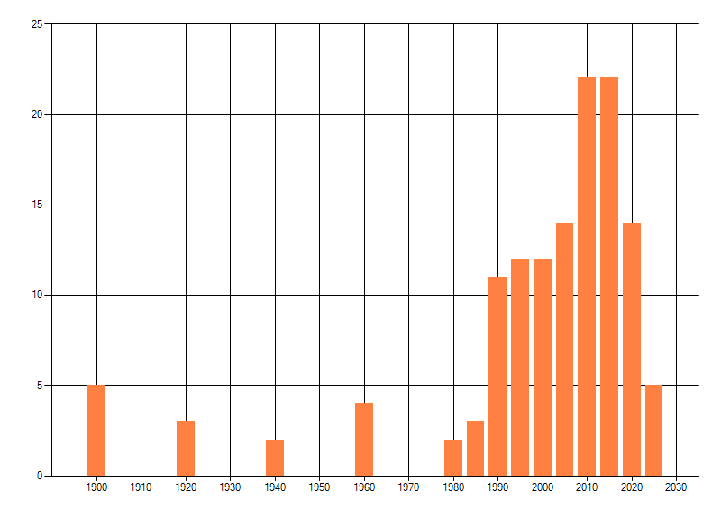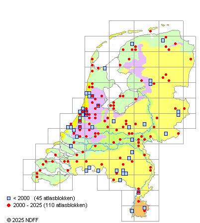 Het aantal atlasblokken (5x5 km) waarin de soort is gemeld binnen een periode van vijf jaar (vanaf 1980) of twintig jaar. Niet gecorrigeerd voor waarnemersinspanning en het aantal doorgegeven waarnemingen kan sterk variëren per periode, dus een trend in verspreiding kan hier niet direct uit worden afgelezen. Het opgegeven jaartal is het eerste jaar van de periode. Bron: gevalideerde waarnemingen uit de NDFF.