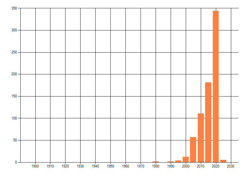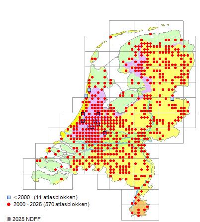 Het aantal atlasblokken (5x5 km) waarin de soort is gemeld binnen een periode van vijf jaar (vanaf 1980) of twintig jaar. Niet gecorrigeerd voor waarnemersinspanning en het aantal doorgegeven waarnemingen kan sterk variëren per periode, dus een trend in verspreiding kan hier niet direct uit worden afgelezen. Het opgegeven jaartal is het eerste jaar van de periode. Bron: gevalideerde waarnemingen uit de NDFF.