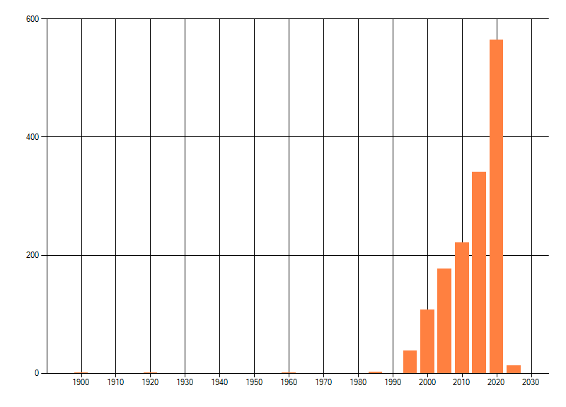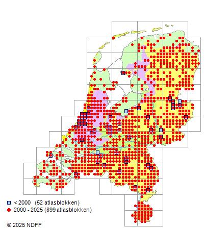Het aantal atlasblokken (5x5 km) waarin de soort is gemeld binnen een periode van vijf jaar (vanaf 1980) of twintig jaar. Niet gecorrigeerd voor waarnemersinspanning en het aantal doorgegeven waarnemingen kan sterk variëren per periode, dus een trend in verspreiding kan hier niet direct uit worden afgelezen. Het opgegeven jaartal is het eerste jaar van de periode. Bron: gevalideerde waarnemingen uit de NDFF.