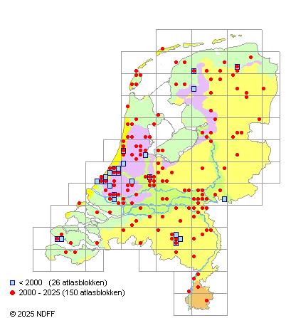 Het aantal atlasblokken (5x5 km) waarin de soort is gemeld binnen een periode van vijf jaar (vanaf 1980) of twintig jaar. Niet gecorrigeerd voor waarnemersinspanning en het aantal doorgegeven waarnemingen kan sterk variëren per periode, dus een trend in verspreiding kan hier niet direct uit worden afgelezen. Het opgegeven jaartal is het eerste jaar van de periode. Bron: gevalideerde waarnemingen uit de NDFF.