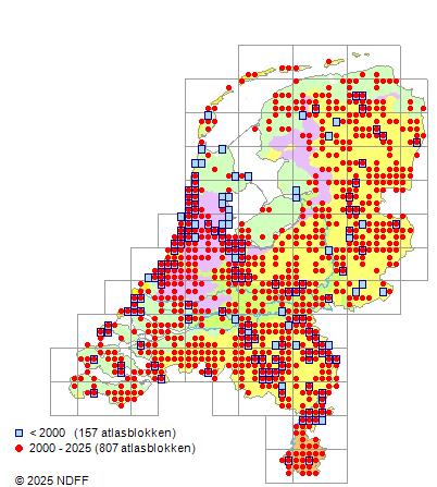 Het aantal atlasblokken (5x5 km) waarin de soort is gemeld binnen een periode van vijf jaar (vanaf 1980) of twintig jaar. Niet gecorrigeerd voor waarnemersinspanning en het aantal doorgegeven waarnemingen kan sterk variëren per periode, dus een trend in verspreiding kan hier niet direct uit worden afgelezen. Het opgegeven jaartal is het eerste jaar van de periode. Bron: gevalideerde waarnemingen uit de NDFF.