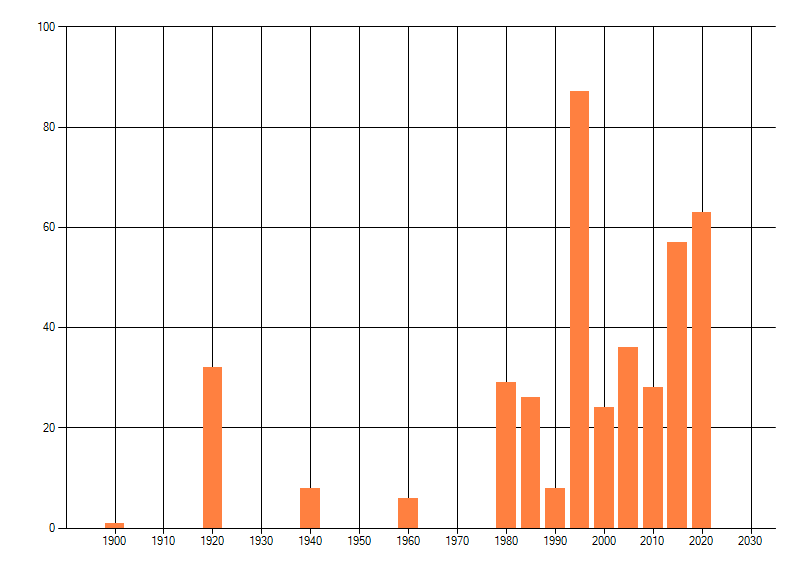 Het aantal atlasblokken (5x5 km) waarin de soort is gemeld binnen een periode van vijf jaar (vanaf 1980) of twintig jaar. Niet gecorrigeerd voor waarnemersinspanning en het aantal doorgegeven waarnemingen kan sterk variëren per periode, dus een trend in verspreiding kan hier niet direct uit worden afgelezen. Het opgegeven jaartal is het eerste jaar van de periode. Bron: gevalideerde waarnemingen uit de NDFF.
