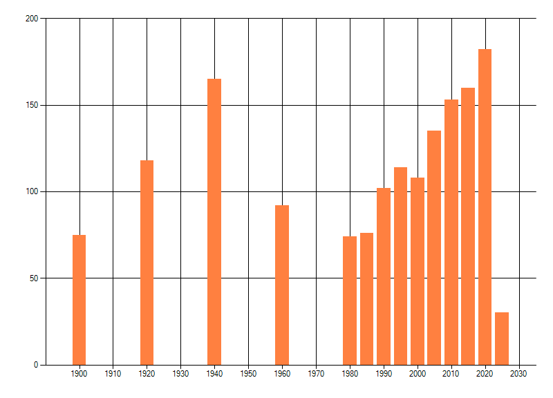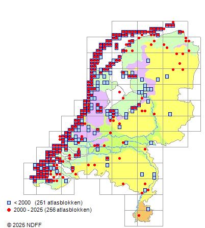 Het aantal atlasblokken (5x5 km) waarin de soort is gemeld binnen een periode van vijf jaar (vanaf 1980) of twintig jaar. Niet gecorrigeerd voor waarnemersinspanning en het aantal doorgegeven waarnemingen kan sterk variëren per periode, dus een trend in verspreiding kan hier niet direct uit worden afgelezen. Het opgegeven jaartal is het eerste jaar van de periode. Bron: gevalideerde waarnemingen uit de NDFF.