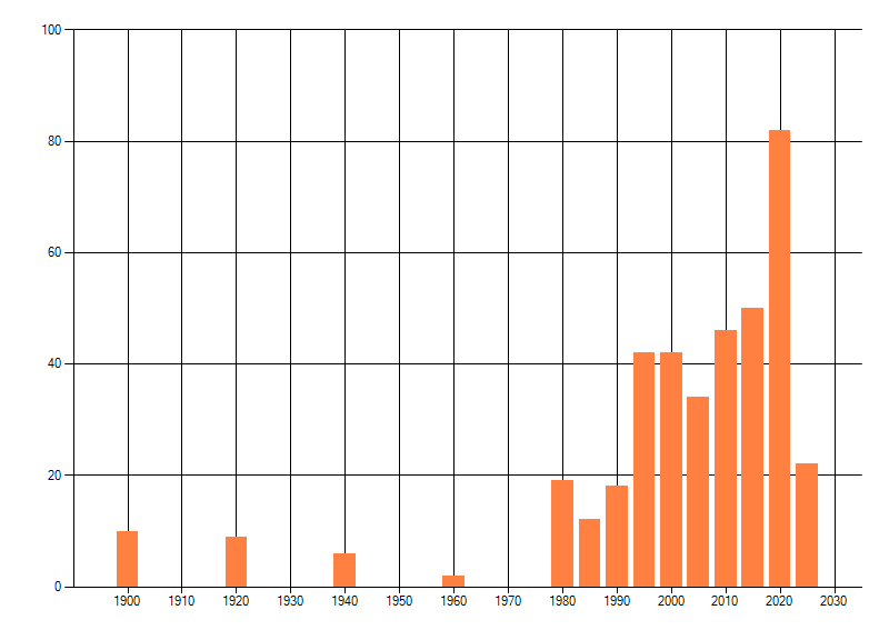 Het aantal atlasblokken (5x5 km) waarin de soort is gemeld binnen een periode van vijf jaar (vanaf 1980) of twintig jaar. Niet gecorrigeerd voor waarnemersinspanning en het aantal doorgegeven waarnemingen kan sterk variëren per periode, dus een trend in verspreiding kan hier niet direct uit worden afgelezen. Het opgegeven jaartal is het eerste jaar van de periode. Bron: gevalideerde waarnemingen uit de NDFF.