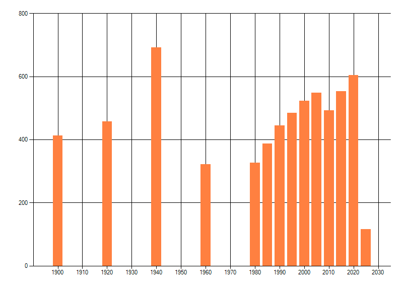 Het aantal atlasblokken (5x5 km) waarin de soort is gemeld binnen een periode van vijf jaar (vanaf 1980) of twintig jaar. Niet gecorrigeerd voor waarnemersinspanning en het aantal doorgegeven waarnemingen kan sterk variëren per periode, dus een trend in verspreiding kan hier niet direct uit worden afgelezen. Het opgegeven jaartal is het eerste jaar van de periode. Bron: gevalideerde waarnemingen uit de NDFF.