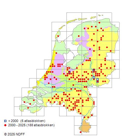 Het aantal atlasblokken (5x5 km) waarin de soort is gemeld binnen een periode van vijf jaar (vanaf 1980) of twintig jaar. Niet gecorrigeerd voor waarnemersinspanning en het aantal doorgegeven waarnemingen kan sterk variëren per periode, dus een trend in verspreiding kan hier niet direct uit worden afgelezen. Het opgegeven jaartal is het eerste jaar van de periode. Bron: gevalideerde waarnemingen uit de NDFF.