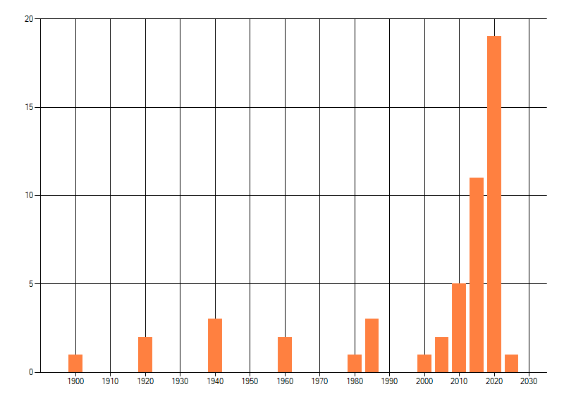 Het aantal atlasblokken (5x5 km) waarin de soort is gemeld binnen een periode van vijf jaar (vanaf 1980) of twintig jaar. Niet gecorrigeerd voor waarnemersinspanning en het aantal doorgegeven waarnemingen kan sterk variëren per periode, dus een trend in verspreiding kan hier niet direct uit worden afgelezen. Het opgegeven jaartal is het eerste jaar van de periode. Bron: gevalideerde waarnemingen uit de NDFF.