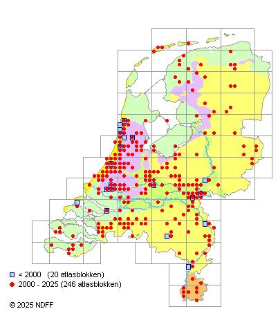 Het aantal atlasblokken (5x5 km) waarin de soort is gemeld binnen een periode van vijf jaar (vanaf 1980) of twintig jaar. Niet gecorrigeerd voor waarnemersinspanning en het aantal doorgegeven waarnemingen kan sterk variëren per periode, dus een trend in verspreiding kan hier niet direct uit worden afgelezen. Het opgegeven jaartal is het eerste jaar van de periode. Bron: gevalideerde waarnemingen uit de NDFF.