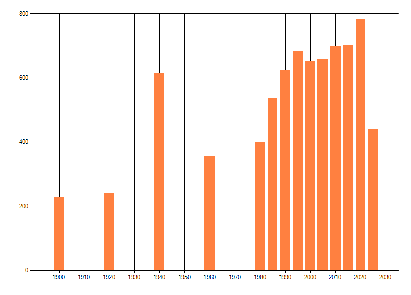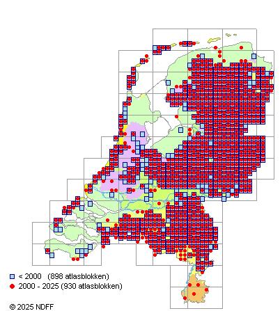 Het aantal atlasblokken (5x5 km) waarin de soort is gemeld binnen een periode van vijf jaar (vanaf 1980) of twintig jaar. Niet gecorrigeerd voor waarnemersinspanning en het aantal doorgegeven waarnemingen kan sterk variëren per periode, dus een trend in verspreiding kan hier niet direct uit worden afgelezen. Het opgegeven jaartal is het eerste jaar van de periode. Bron: gevalideerde waarnemingen uit de NDFF.