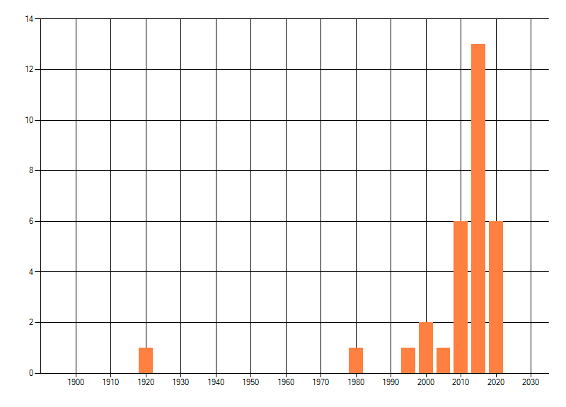 Het aantal atlasblokken (5x5 km) waarin de soort is gemeld binnen een periode van vijf jaar (vanaf 1980) of twintig jaar. Niet gecorrigeerd voor waarnemersinspanning en het aantal doorgegeven waarnemingen kan sterk variëren per periode, dus een trend in verspreiding kan hier niet direct uit worden afgelezen. Het opgegeven jaartal is het eerste jaar van de periode. Bron: gevalideerde waarnemingen uit de NDFF.