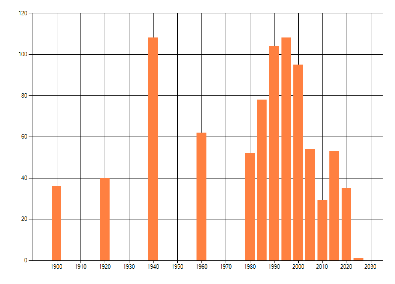 Het aantal atlasblokken (5x5 km) waarin de soort is gemeld binnen een periode van vijf jaar (vanaf 1980) of twintig jaar. Niet gecorrigeerd voor waarnemersinspanning en het aantal doorgegeven waarnemingen kan sterk variëren per periode, dus een trend in verspreiding kan hier niet direct uit worden afgelezen. Het opgegeven jaartal is het eerste jaar van de periode. Bron: gevalideerde waarnemingen uit de NDFF.