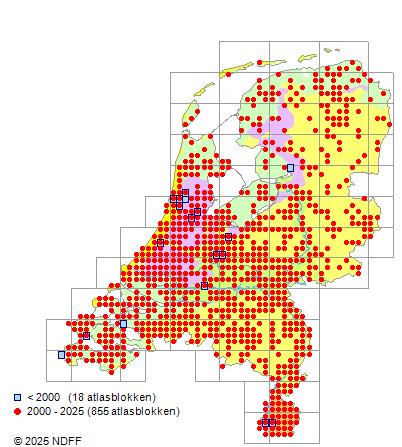 Het aantal atlasblokken (5x5 km) waarin de soort is gemeld binnen een periode van vijf jaar (vanaf 1980) of twintig jaar. Niet gecorrigeerd voor waarnemersinspanning en het aantal doorgegeven waarnemingen kan sterk variëren per periode, dus een trend in verspreiding kan hier niet direct uit worden afgelezen. Het opgegeven jaartal is het eerste jaar van de periode. Bron: gevalideerde waarnemingen uit de NDFF.
